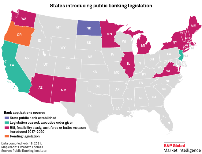 Oregon legislators on Jan. 11 introduced a bill that would launch a public bank. Washington officials on Jan. 13 introduced a bill to create a state bank. New Mexico lawmakers on Feb. 1 proposed legislation, in both the Houseand Senate, to open a state-level public bank. In Philadelphia, city officials on Jan. 28 proposed a public bank bill. Since 2017, several other states and municipalities have passed some type of public banking legislation, such as creating task forces to study the issue. And congressional leaders have raised the prospect at the federal level, including an infrastructure bank and a postal bank.